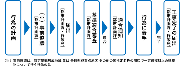 行為の種類や規模、期間などを市に届け出て、適合審査を受けてください。