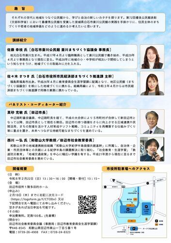 第1部【講師】 佐藤 幸枝 氏[白石市斎川公民館 斎川まちづくり協議会 事務長] 佐々木 さつき 氏[白石市役所市民経済部まちづくり推進課 主幹] 第2部【パネリスト、コーディネーター】 佐藤 幸枝 氏 佐々木 さつき 氏 真砂 充敏 氏[田辺市長] 西川 一弘 氏[和歌山大学教授、田辺市社会教育委員] |