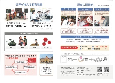 紀南ユネスコ協会は、日本ユネスコ協会連盟が「ユネスコ世界寺子屋運動」の一環として実施している「書きそんじハガキ・キャンペーン」への協力として、紀南地域の皆様より書きそんじハガキ(書き間違えるなどして投函しなかったハガキ)を集め、それらを換金し、日本ユネスコ協会連盟に送付します。世界寺子屋運動は、教育を受けられずにいる子どもや大人に無償で学べる教育の場(寺子屋)を提供しています。