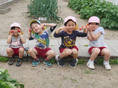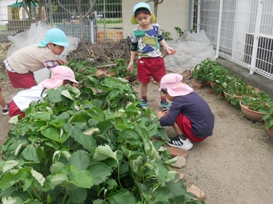 今年もおいしそうないちごの実がいっぱい。子ども達は自分で探して収穫して食べています。