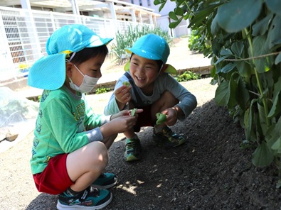 スナップえんどうやそら豆を収穫しました。「手が豆のにおいする!」新鮮な野菜を収穫するといろいろな発見があります。