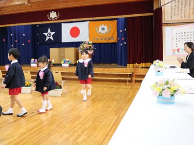 年長児は、年少児が入園する日を楽しみに待っていました。今年は4名の新入園児です。