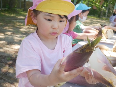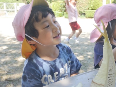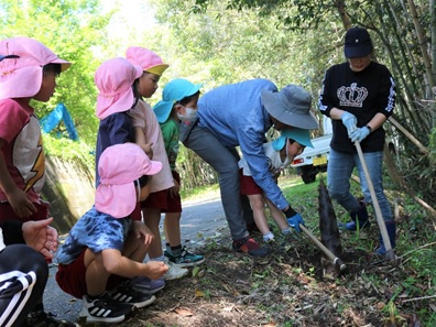 保護者の方が「たけのこ掘り、一緒にしよう」と声をかけてくれて、子ども達はくわを使って掘ってみました。