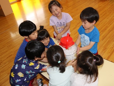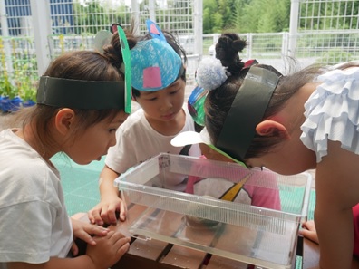 毎日覗いていると、「カエルになってるってことじゃない?」と、見つけました。 年少児は自分もカエルのお面をつけてカエルになりきって遊んでいます。