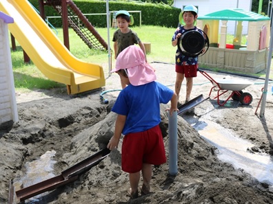 山に穴を開けて、樋をとおして水の流れを楽しんでいると、「流しそうめんしよう」と細長い草を取ってきました。うまく流れるかなと見守っています。