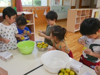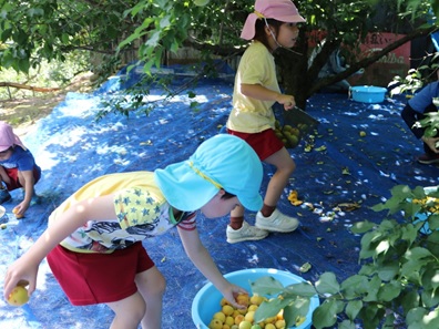 保護者の方が「梅拾いに来てね」と声をかけてくださいました。畑に入ると 梅の甘ーい香りがしてきて「いいにおいがするね」と子ども達。一粒ずつ手に取り拾っていきました。