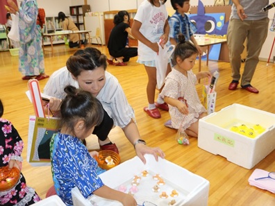 ヨーヨーやおもちゃすくい、輪投げ…お家の人と一緒にお店を楽しみました。