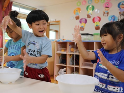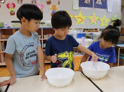 「冷たーい」 「気持ちいい」 「みてー 長ーい」… 混ぜていくと どんどん変化していく感覚を自分の手で存分に味わっています。