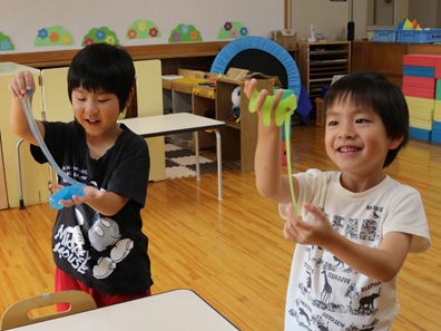 好きな色をつけています。伸ばして伸ばして、また形が変わって、楽しく遊びました。