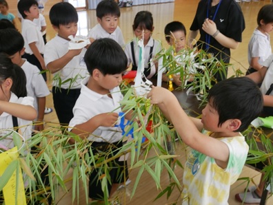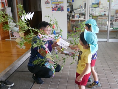 友達やお家の人と一緒に笹飾りを作ったり、願い事を書いたりしました。