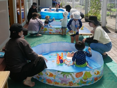 お家の人同士、和やかに話をしながら、子ども達はお友達とプールで気持ちよさそうに遊びました。