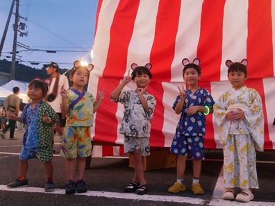 子ども達は甚平や浴衣を着て、たぬきの耳と尻尾をつけて櫓の前で盆踊りを踊りました。