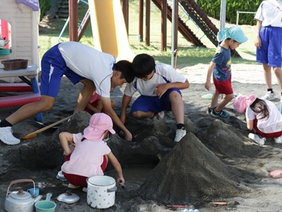 砂場では、園児の「やりたい」に耳を傾けて、一緒にどんどんとトンネルや山を作ってくれました。