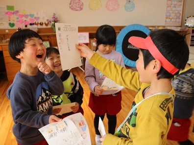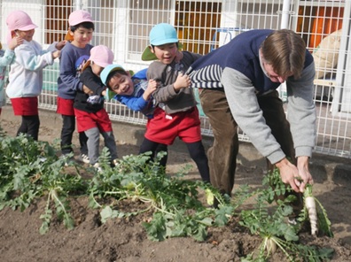 大きな大根ごっこをしました。みんなで力を合わせて大根を抜き、ピーター先生へのお土産です。