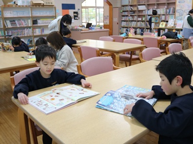 小学校でも幼稚園と同じ絵本があり、見つけてはうれしそうにしていたり、読みたい絵本を見つけて興味をもって読んだりしています。