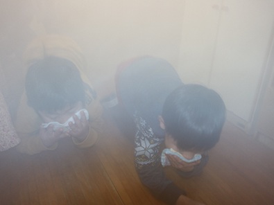 煙体験です。煙は下の方が少ないことが実際に分かり、低い姿勢にして鼻と口を押えて移動しています。