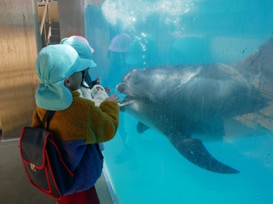 イルカショーの後、イルカのプールに近づくと、イルカが近くに寄ってきてくれて、大喜びでした。