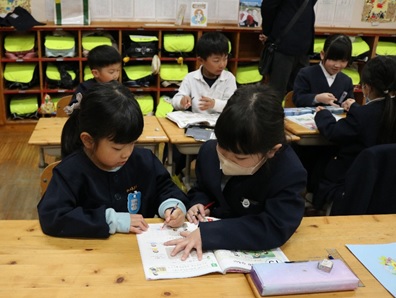 年長児が上秋津小学校に体験入学をしました。校舎内を案内してもらい、授業を見せてもらいました。